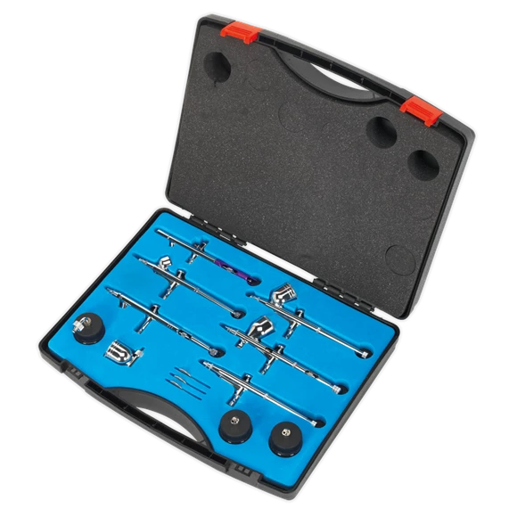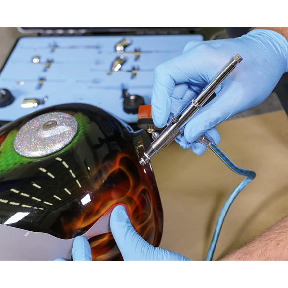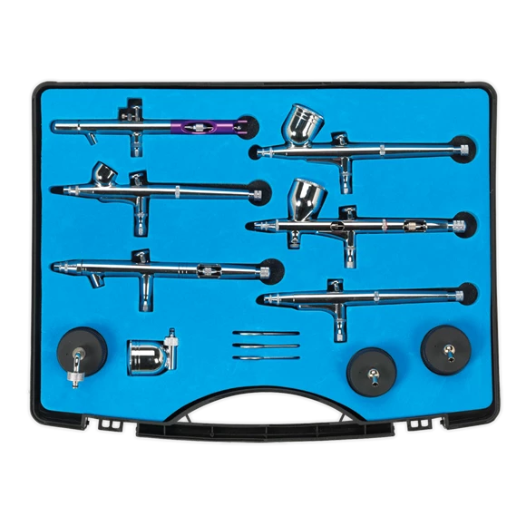 - Comprehensive mini air brush kit, including suction and gravity feed pots.