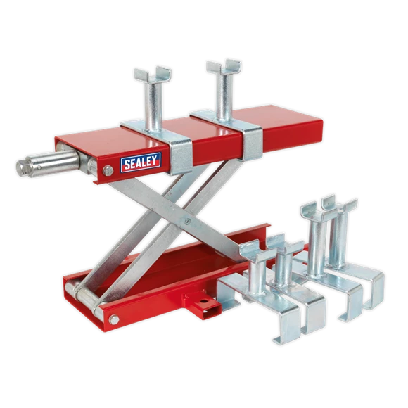 - Scissor support stand suitable for use either on a motorcycle lift or on the floor.