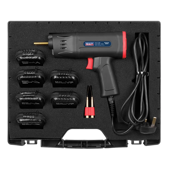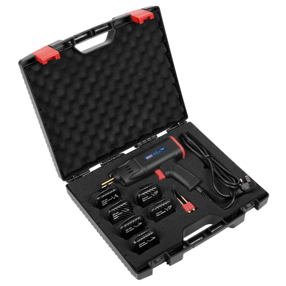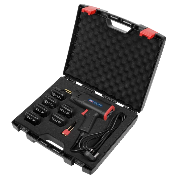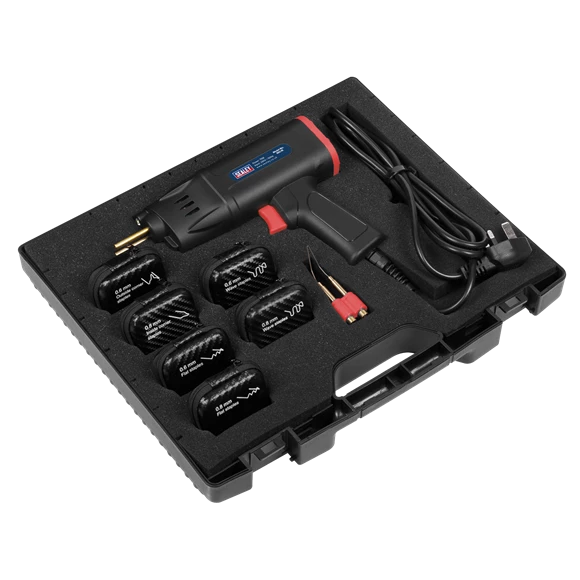 - Kit comprises of staples; 0.6mm outside corner (x50), 0.8mm inside corner (x50), 0.6mm flat (x50), 0.8mm flat (x50), 0.6mm wave (x50), 0.8mm wave (x50), soldering iron tip (x1), heat gun (x1).