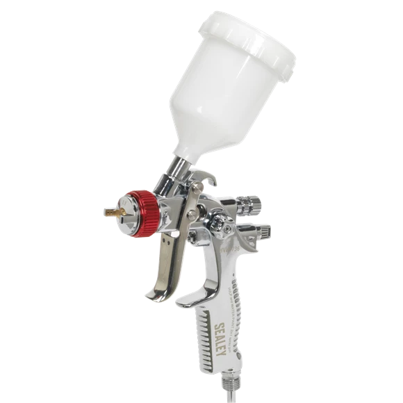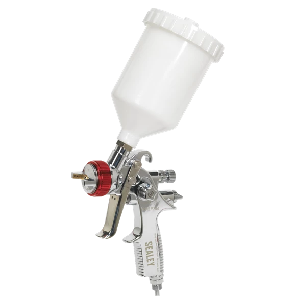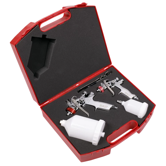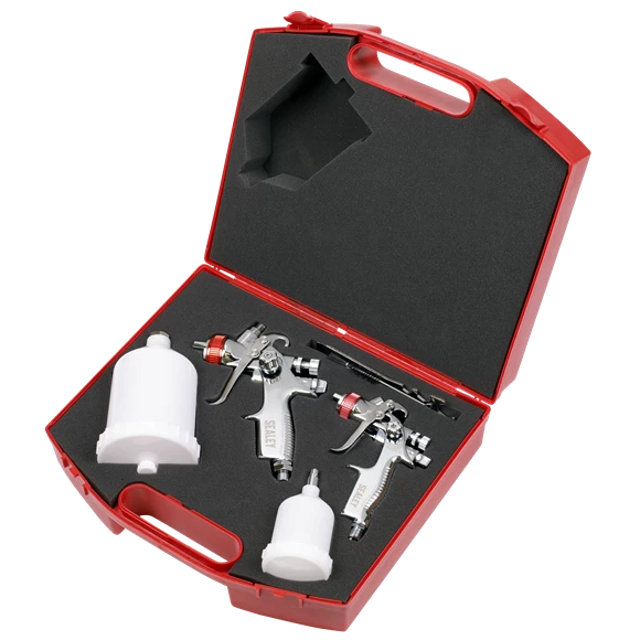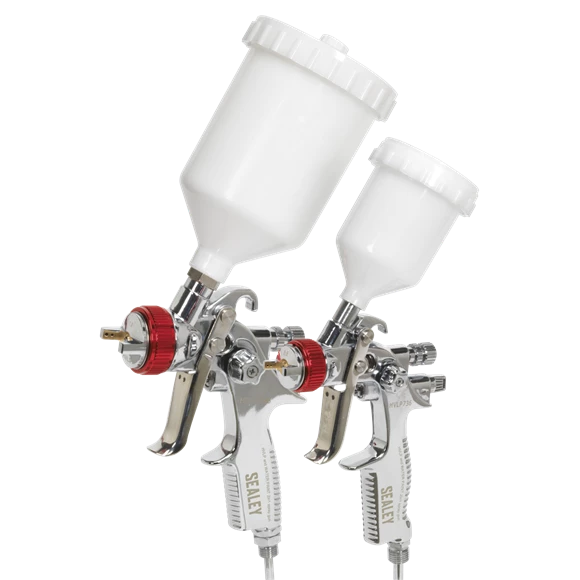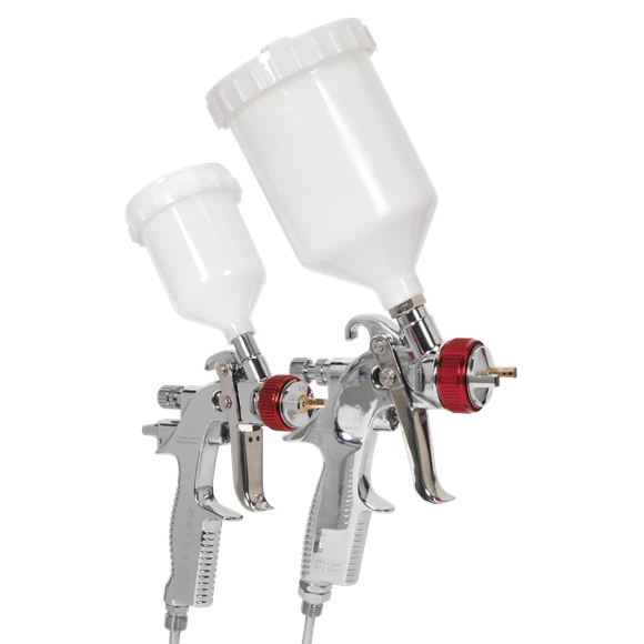 - Professional gravity feed spray gun set comprising a 0.8mm HVLP touch-up gun and a 1.3mm HVLP top-coat gun for larger coverage.