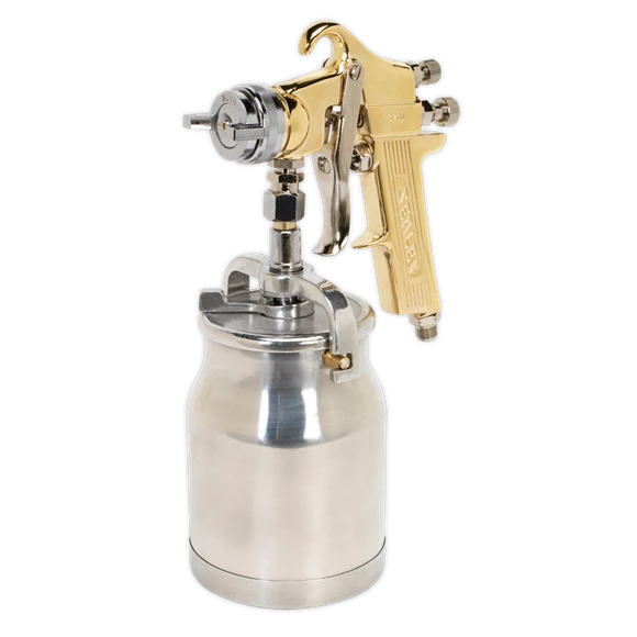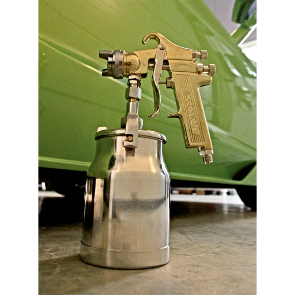 - Spray gun with gold finish handle suitable for applying finishing coats.
